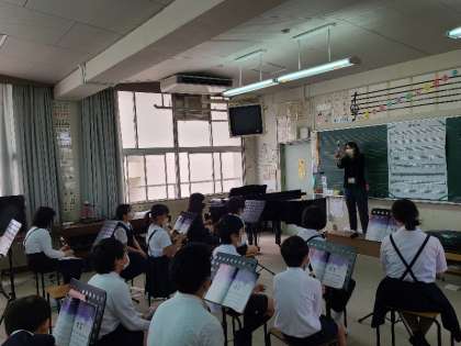 6年2組の音楽の様子です。リコーダーの学習ですが、コロナ対策でリコーダーを吹くことができません。音は出すことができませんが、しっかりと指使いの学習をしていました。