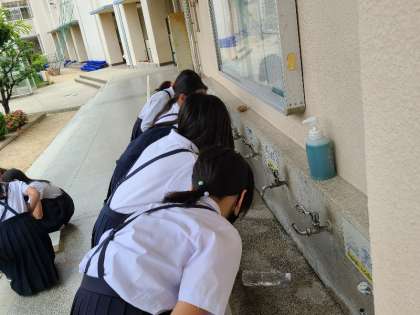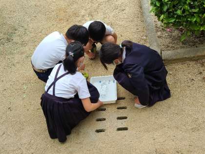 4年2組の理科の様子です。水の流れがある所の地面の傾きを調べています。