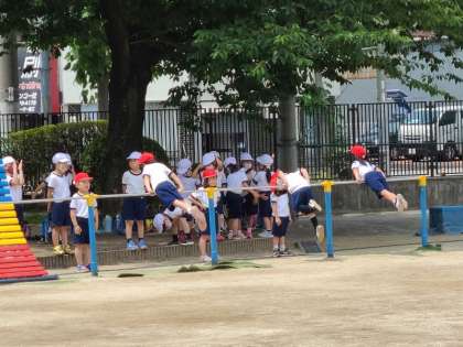 写真上:1年3組の鉄棒を使った運動遊びの様子です。運動をしていない児童は日陰から見学しています。