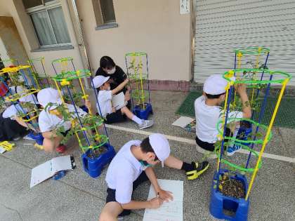 写真下:2年1組のせいかつかの様子です。トマトの成長を観察しています。物差しで葉の大きさを調べている児童もいました。