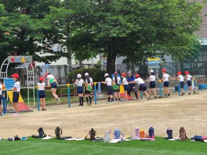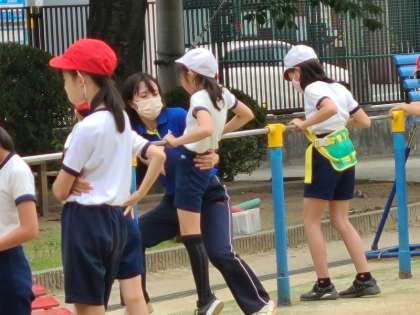 5年1組の体育の様子です。鉄棒運動です。支持回転技に挑戦していいました。お腹が鉄棒から離れないように頑張っていました。