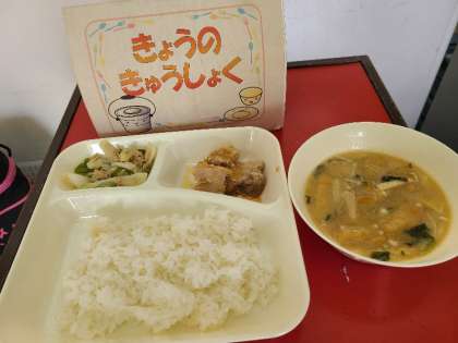 今日の給食は、鶏肉のおろしじょうゆかけ、みそ汁、野菜いため、ごはん、牛乳です。いただきます。