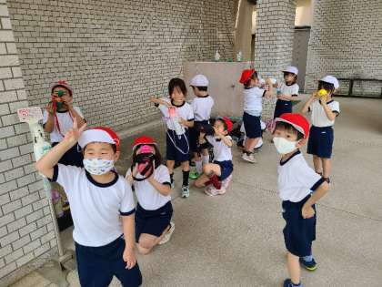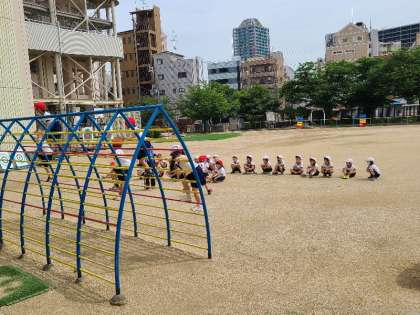 1年2組の体育の様子です。固定施設を使った運動遊びの様子です。運動の前にしっかりと水分補給をしていました。