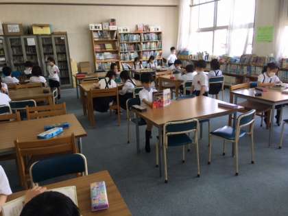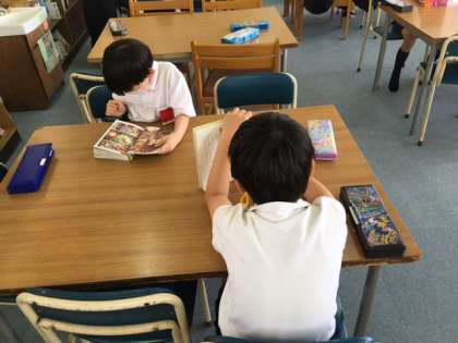 図書の時間は図書室で自分の好きな本を読んでいます。静かに読むことができています。
