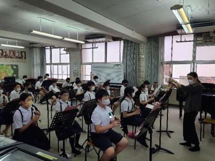 1組は音楽です。リコーダーの学習の後、合奏の練習をしていました。
