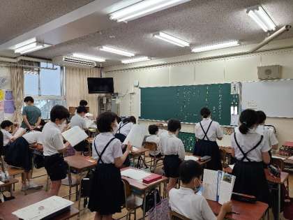 2組は国語です。座って、立って、歩きながら等、繰り返し音読をしていました。