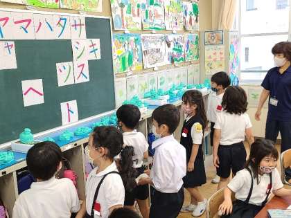 1年1組の図工の様子です。お友だちの作品をみんなでみて評価していました。細かな表現などお友だちの作品の良い所をみていました。