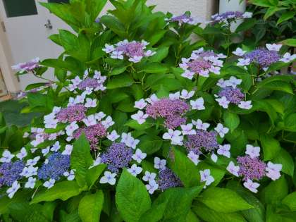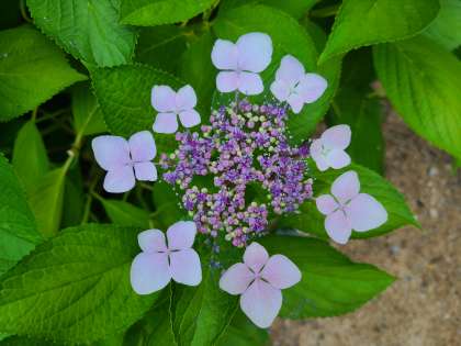 体育館の入り口横のガクアジサイです。原産国は日本で、花の中心に集まっているちいさなつぼみのようなものが花びらで、その外側にガクが大きな花びらのようについています。