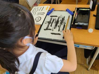 3年1組の書写の様子です。毛筆の学習は初めてです。毛筆の硬さや持ち方等を学習しました。