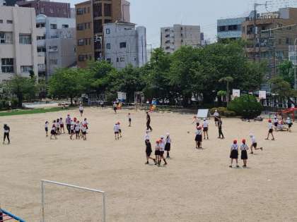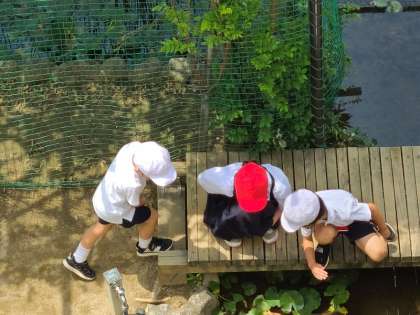 運動場は元気な子どもたちでいっぱいです。池に落ちないように観察してくださいね。