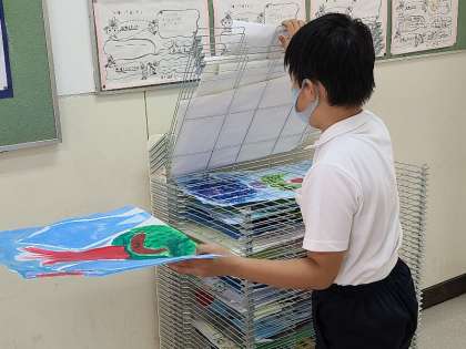 2組は図工です。作品を収納しています。他の先生から「上手にできたね」と褒めてもらっていました。