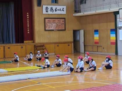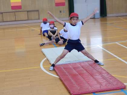 3年1組の体育のマット運動の様子です。基本的な回転技と発展技を組み合わせて練習していました。演技後のフィニッシュもしっかりと止まりきれいに決まりました。