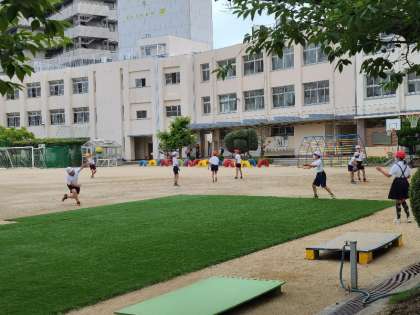登校後運動場で遊んでいます。遊びの中で、投げるや受けるがとても上手くなってきているのがわかります。
