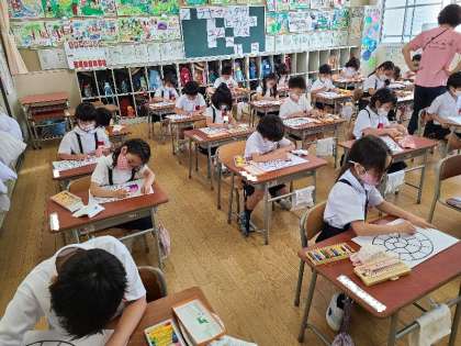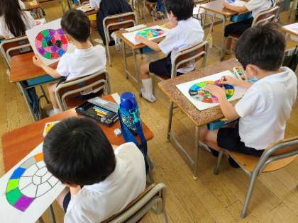 1年1組と2組の図工の様子です。パスタでカタツムリのからの模様を描いていました。となりどうしのからの色が同じにならないように考え、丁寧に描いていました。