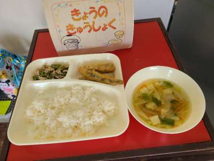 今日の給食は、いわしのてんぷら、五目汁、豚肉とさんどまめのいためもの、ごはん、牛乳です。いただきます。