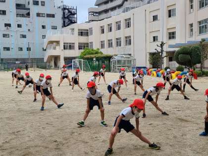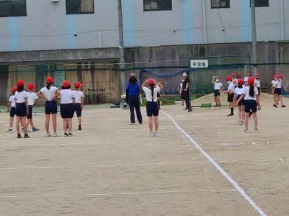 5年生の新体力テストのソフトボール投げの様子です。少しでも記録を伸ばすために、防球ネットの上部にゴムを通して、そのゴムの上を投げるように工夫しています。