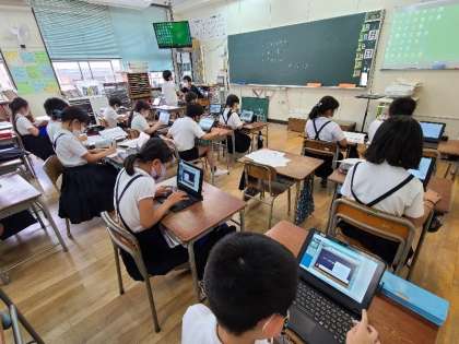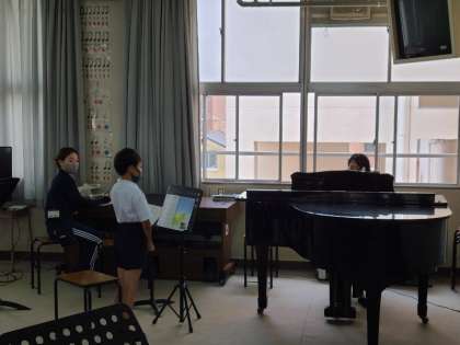 4年1組の音楽の様子です。歌のテストをしています。感染対策として、テスト受験者は音楽室、他の児童は教室でデジタルアプリで学習をしていました。