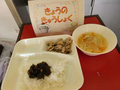 今日の給食は、豚肉のごまみそ焼き、すまし汁、のりのつくだ煮、ごはん、牛乳です。手洗いもしっかりできました。いただきます。