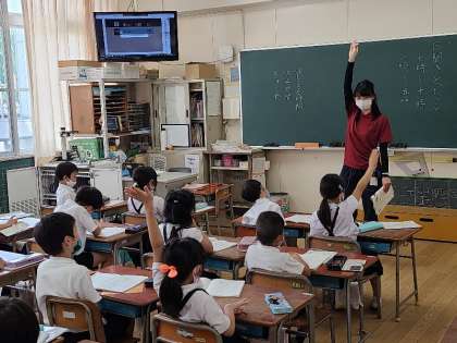 2年1組の国語の様子です。課題は「外国の小学校について聞こう」です。外国の小学校について音声の説明を聞いて、ノートにまとめ、発表していました。