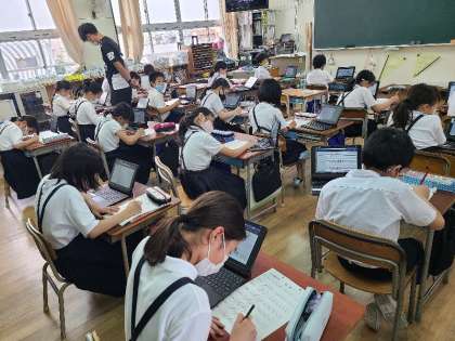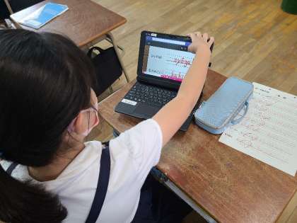 4年2組の国語です。ローマ字のテストをしていました。確認はタブレットを活用していました。