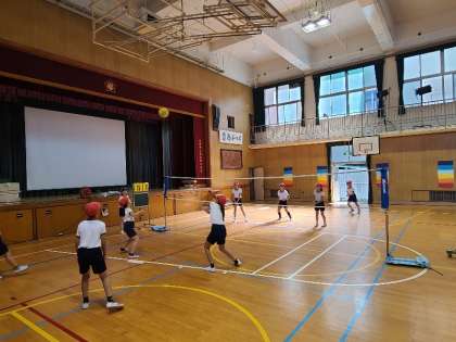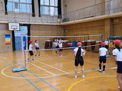 5年1組の体育の様子です。ネット型のボール運動です。子どもたちは「もっとボールを高くあげよう」など互いに声をかけあいゲームを進めていました。