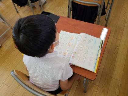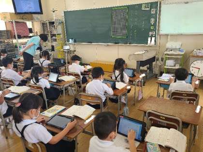 1年1組と3組の国語の様子です。タブレット等のICT機器を活用して学習していました。教科書の挿絵を見て、「絵にもヒントがあるよ」と教えてくれました。感心しました。