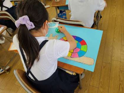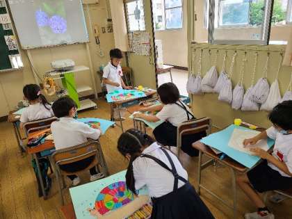 1年2組の図工の様子です。カタツムリのからの色を描き終わったら、次はあじさいを描いていました。