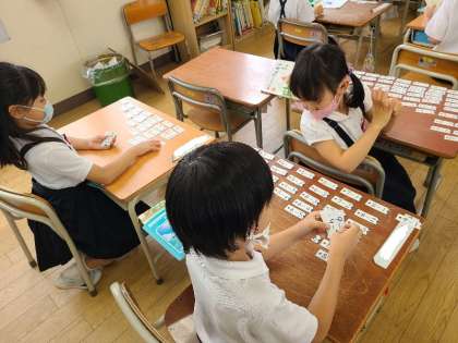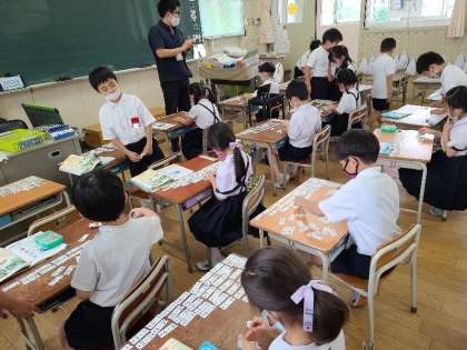 1年3組の算数の様子です。カードを並べています。先生の話を聞いて、丁寧に取り組んでいました。