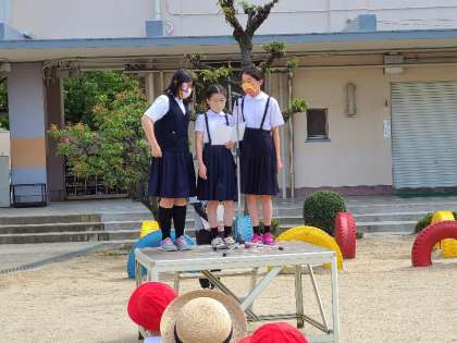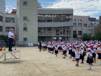 本日児童朝会を行いました。校長先生からは「プール指導」について、保健委員会からは「背筋シャキーン週間」と「姿勢ペンダント」の活用についてお話がありました。最後に担当の先生から週目標についてお話がありました。今週の目標は「姿勢を正しくしよう。」です。