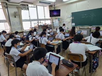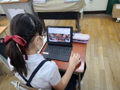 6年1組の英語の様子です。日本の祭りを英語で紹介します。日本各地の祭りをタブレットで調べ、英語の紹介文を作成していました。
