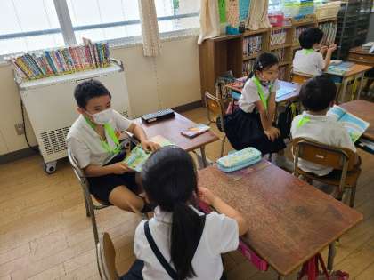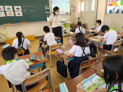 3年2組の英語の様子です。互いに英語で、好きな色について会話をしていました。