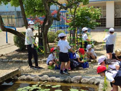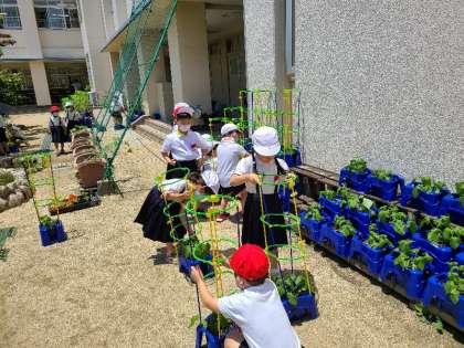 1年3組のせいかつかの様子です。朝顔のつるが折れないように支柱を立てました。うまくつるが支柱に絡まるといいですね。