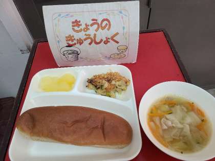今日の給食は、カレードリア、豚肉とキャベツのスープ、りんご(カット缶)、パン、牛乳です。いただきます。