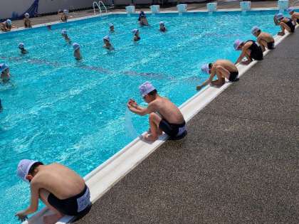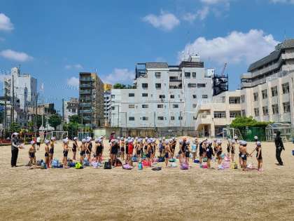 1年生の体育「水遊び」の様子です。運動場で準備運動をしてプールに移動します。シャワーの仕方やプールへの入り方など、プールで活動する時のルールをしっかりと守り、安全で楽しく活動をします。