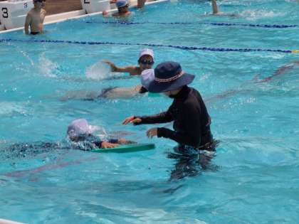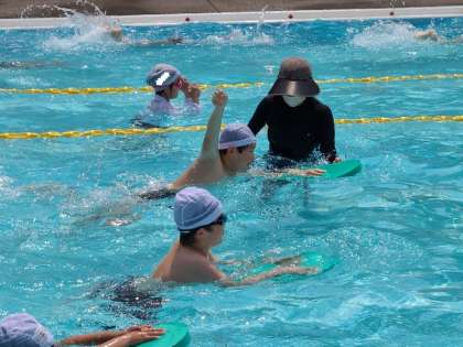 5年生の水泳の様子です。コース別に水泳の練習をしています。今日はビート版も活用していました。
