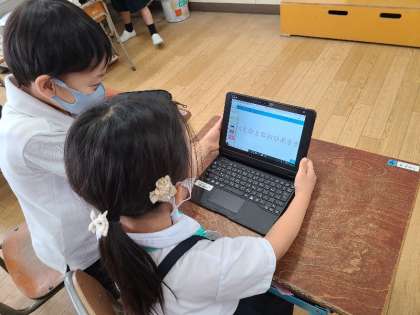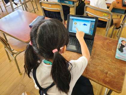 2年1組の休み時間の様子です。タブレットで物語を作成して楽しんでいました。他にもプログラミングのゲームをして楽しんでいました。