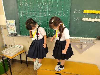 1年生の様子です。片足でバランスよく立てるか競争していました。楽しいひと時ですね。
