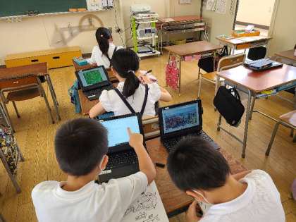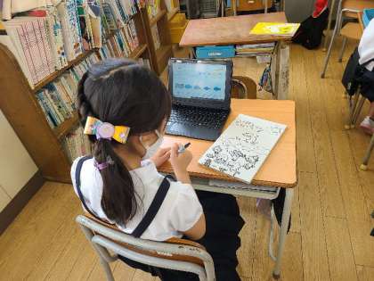 3年1組の様子です。自主的に図工の作業をしています。タブレットで調べて下絵を描いているようです。どんな作品ができるのか楽しみです。