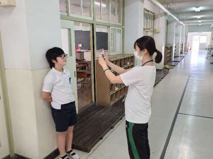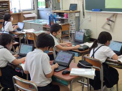 写真中:5年2組がキャリアパスポート作成で写真を撮っていました。