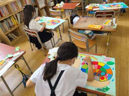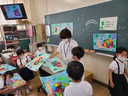 1年1組の図工の様子です。作品を先生に見てもらい仕上げていきます。