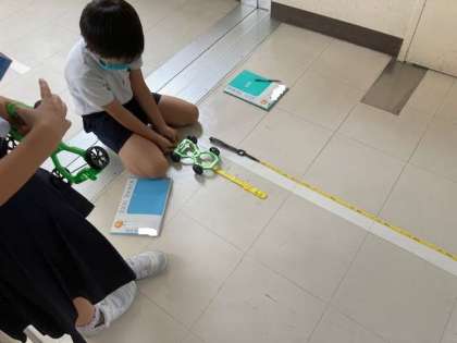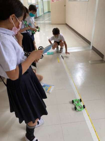 3年2組の理科の様子です。ゴムで動く自動車を作り、ゴムの長さや数を変えて、自動車の走り方を調べています。