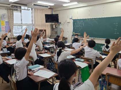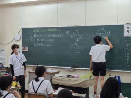 6年生の算数の習熟度別授業の様子です。等しい比どうしの関係を調べて学習していました。挙手の勢いがさすが6年生です。