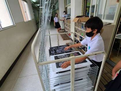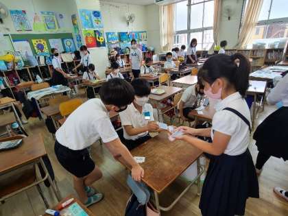 4年2組の様子です。図工の作品を収納したり、カードゲームで遊んだりしています。