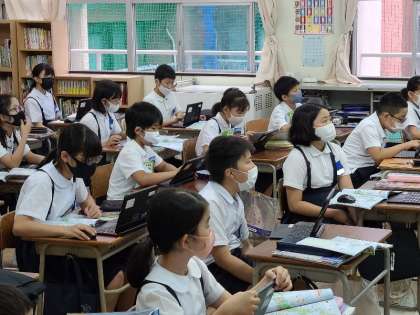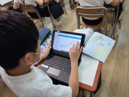5年1組の様子です。社会科の学習です。地域の特産物を調べていました。