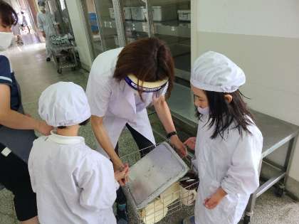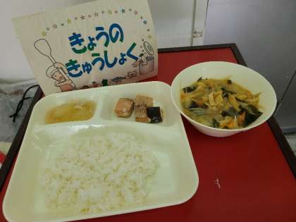 今日の給食は、さけのつけ焼き、みそ汁、どうがんの煮もの、ごはん、牛乳です。いただきます。
