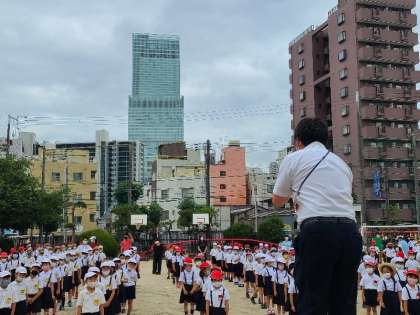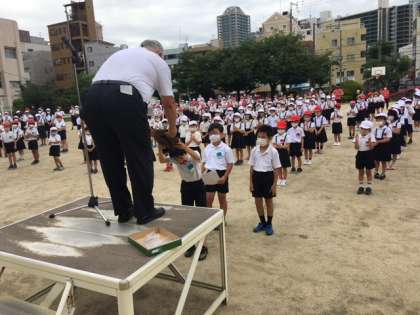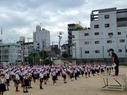 本日運動場で児童朝会を行いました。学校長より賞の伝達のあと、担当の先生より美化活動や週目標についてお話がありました。今週の目標は「雨の日の遊びをしっかり考えよう。」です。