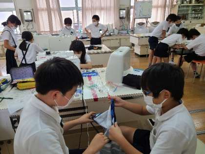 6年2組の家庭科の様子です。マイエプロンも完成まじかです。