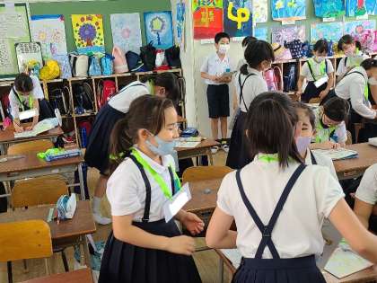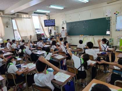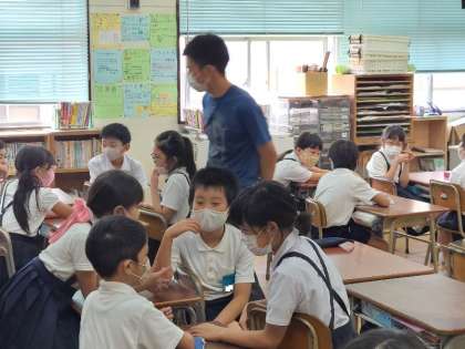 写真下:4年2組の英語の様子です。時間について学習しています。1日のうちで好きな時間とその理由を英語で伝え合っています。