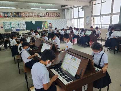 3年2組の音楽の様子です。オルガンの学習です。練習を重ねると少しずつ音やリズムが合わさってくるのがわかります。