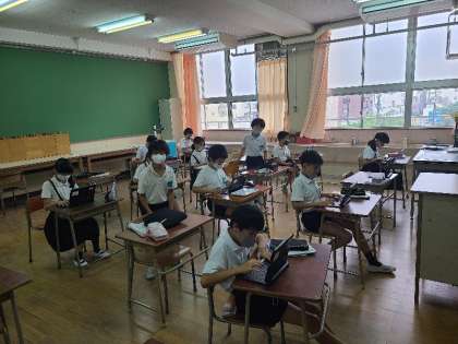 写真上:4年生の様子です。授業と間違えるほど集中してタイピングをしていました。